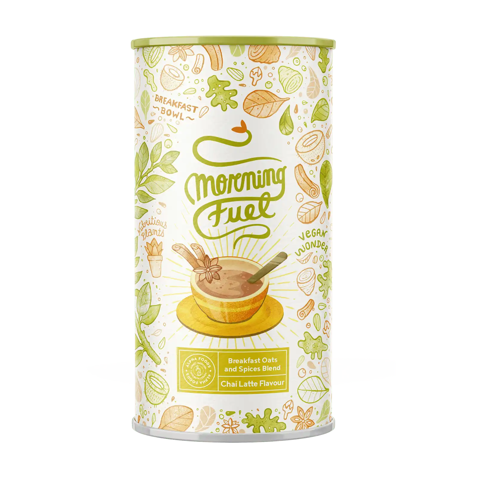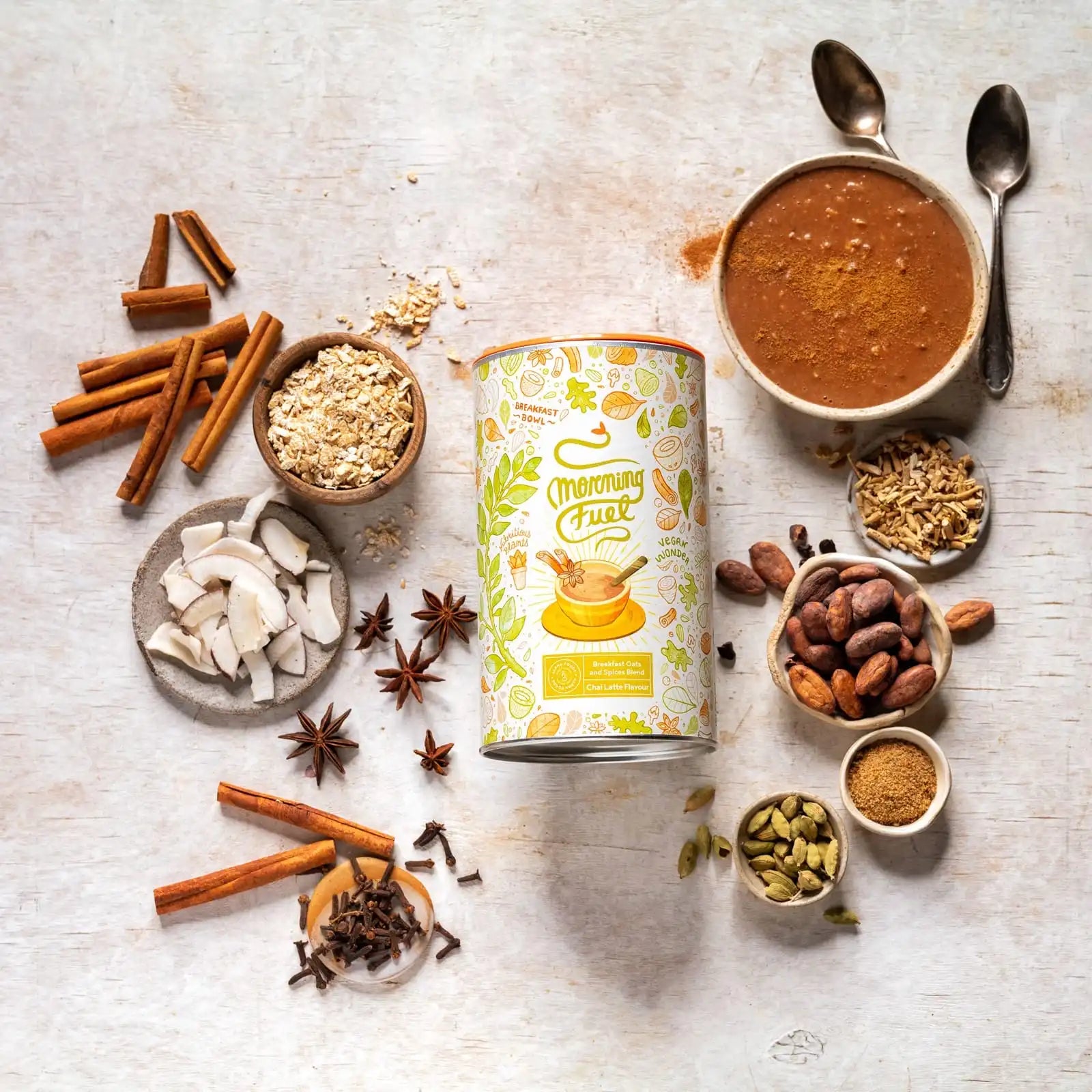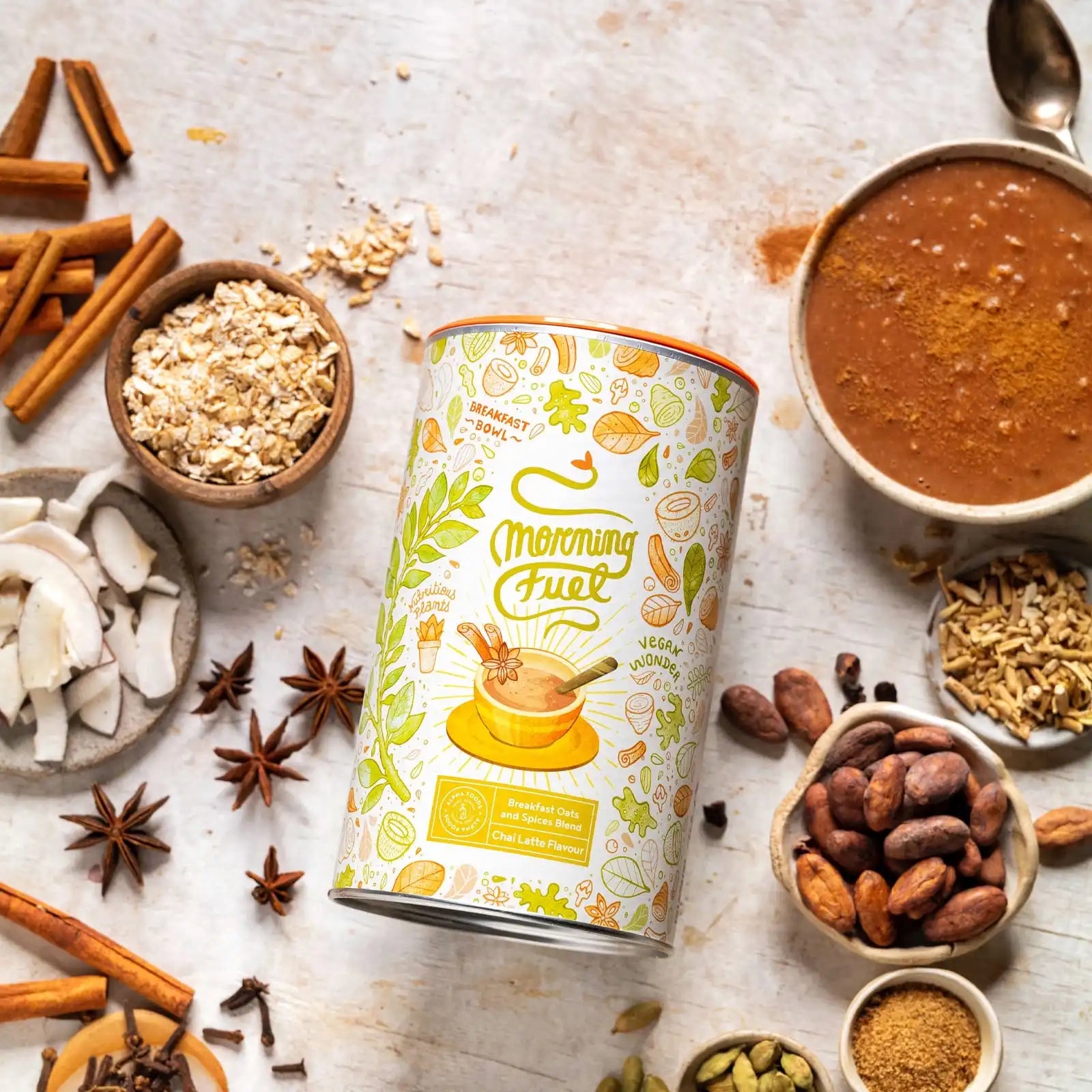 Vegan ontbijtmix met chai latte-smaak. Bevat eiwitten, complexe koolhydraten en macawortel.